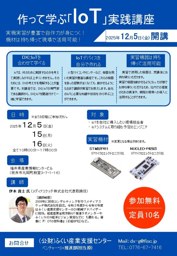 公益財団法人ふくい産業支援センターでは、企業のDX(デジタルトランスフォーメーション)を推進するうえで、県内中小企業の製造業などで特に有効な「IoT」技術について、知識や経験が豊富な専門家から実習中心のカリキュラムで学ぶことにより、実践のための知識や技術を身につける研修を実施します。皆様のご参加をお待ちしています。